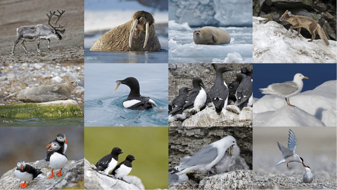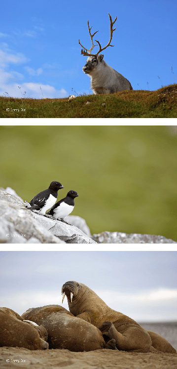 除了北极熊外, 北极斯瓦尔巴群岛的夏天到处可以看到野生动物, 此次航程前往更多极地秘境观赏拍摄野生动物也是最大特色, 有机会观赏拍摄到髯海豹 、港海豹 、北极狐 、斯瓦尔巴驯鹿、 海象 、 多种鲸类 、岩雷鸟 、 以及北极燕鸥 、海鹦 、王绒鸭 、 欧绒鸭 、侏海雀 、厚嘴崖海鸦 、 白翅斑海鸽 、三趾鸥等几十种 、数百万迁徙来此繁衍下一代的海鸟。