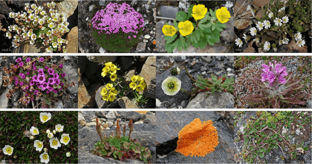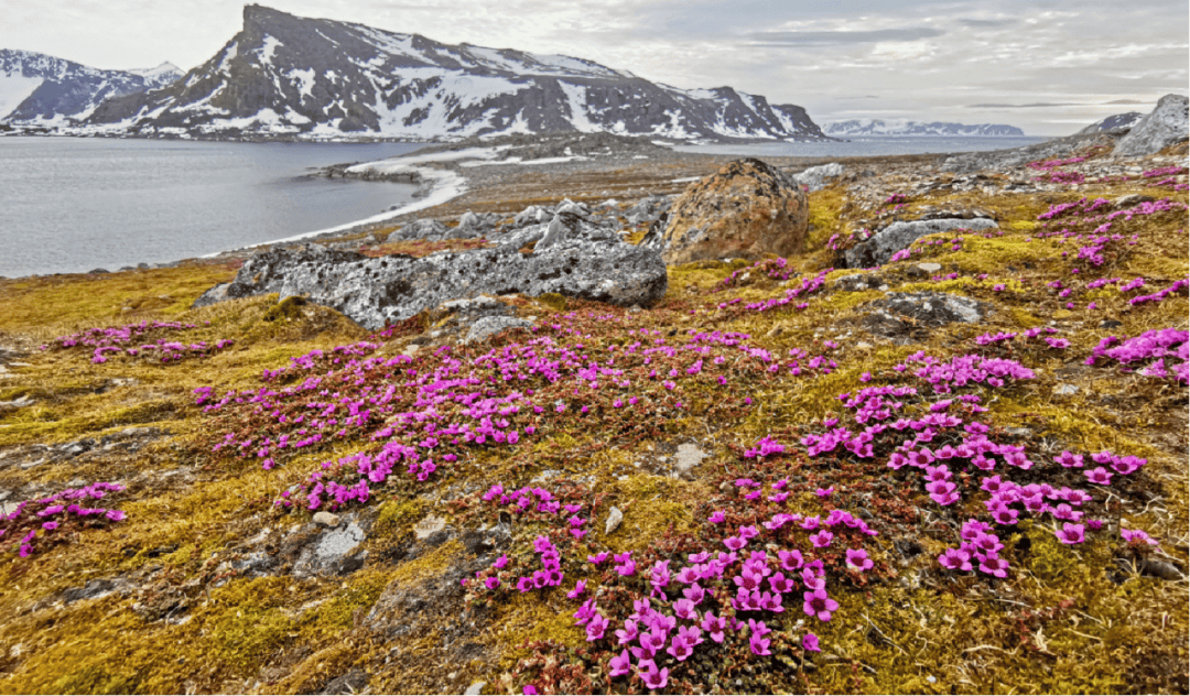 北极斯瓦尔巴群岛有几十种夏日开花植被, 包括山蓼 、北极柳 、无茎蝇子草 、簇绒虎耳草 、仙女木 、北极鼠耳草 、斯瓦尔巴罂粟, 以及各种地衣苔藓等 。 它们的出现使得北极色彩斑斓, 充满生机。