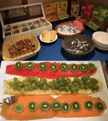 此外每天还有充足的水果供应, 热水 、茶 、咖啡和饼干等24 小时全天供应。