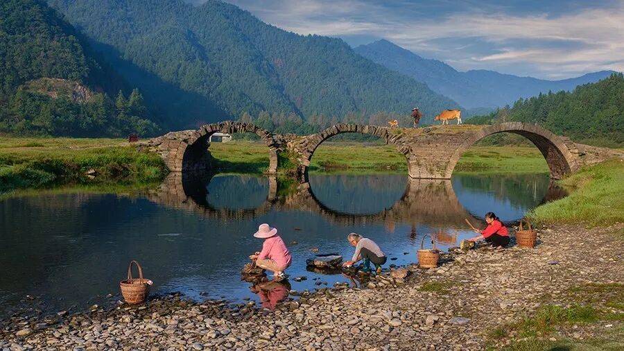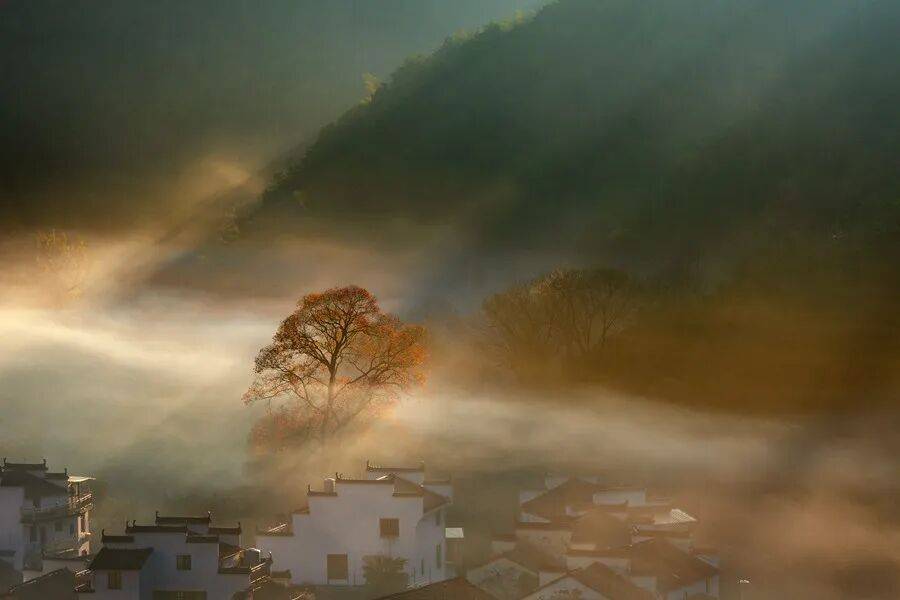 早晨拍摄群山环抱,云雾缭绕的石城晨曦,当一缕缕阳光从山脊洒向晨雾中,晨雾中呈现如流金般的美丽,千年古枫林、徽派民居、袅袅炊烟、交相辉映。在晨曦中恍若人间仙境、世外桃源。早餐后在村里自由创作,中餐后边走边拍,主要拍摄中国最圆的水畔古村落:菊径(镜头赿广赿好),再拍网站布置的农民在小瓦房上劳作等场景,边走边拍田园秋色,后赴晓起,晚餐后进行摄影讲座。 (宿:晓起)