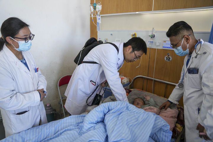 来自大连医科大学附属第一医院的医生田聪亮(左二)和同事在西藏那曲市人民医院查房(2025年7月18日摄)。新华社记者 晋美多吉 摄