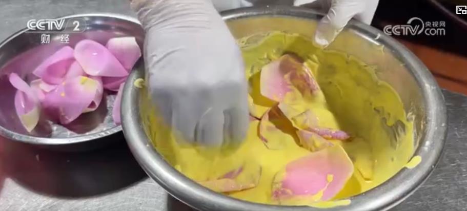 将刚刚采摘的新鲜荷花洗净后,裹上轻盈的蛋清面糊,小火慢炸至金黄,香酥荷花就制作好了,入口酥脆,荷香瞬间弥漫唇齿。