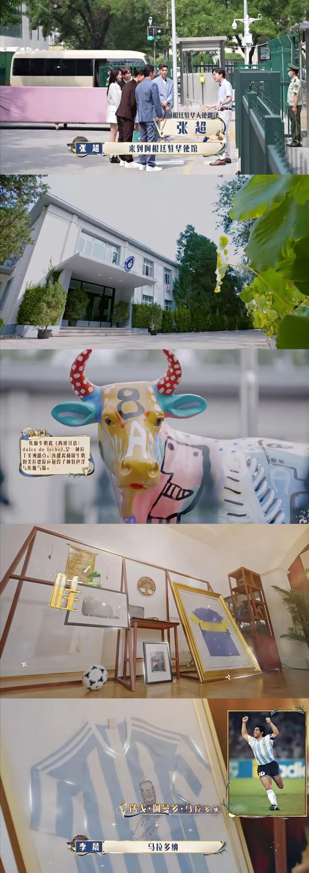 彩绘牛雕塑、马拉多纳球衣、阿根廷国宝级葡萄酒品种马尔贝克、阿根廷在中国内地上映的首部电影《极盗行动》的海报……跟随“美食研习小队”的脚步,颇具神秘色彩的阿根廷驻华使馆首次在荧屏“开放”,新鲜感扑面而来。和李晨、吴尊、何超莲等嘉宾一样,大多数观众也是第一次零距离参观、感受驻华大使馆,不禁发出惊叹:“原来大使馆长这样!”